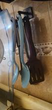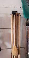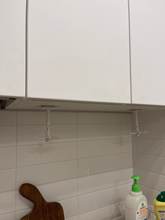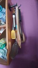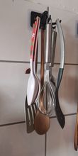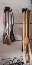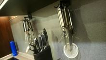 Hold on tight for now. Perfect for hanging it on a wall, it looks a little long to hang it under a kitchen cabinet. The utensils are well grouped and collected.